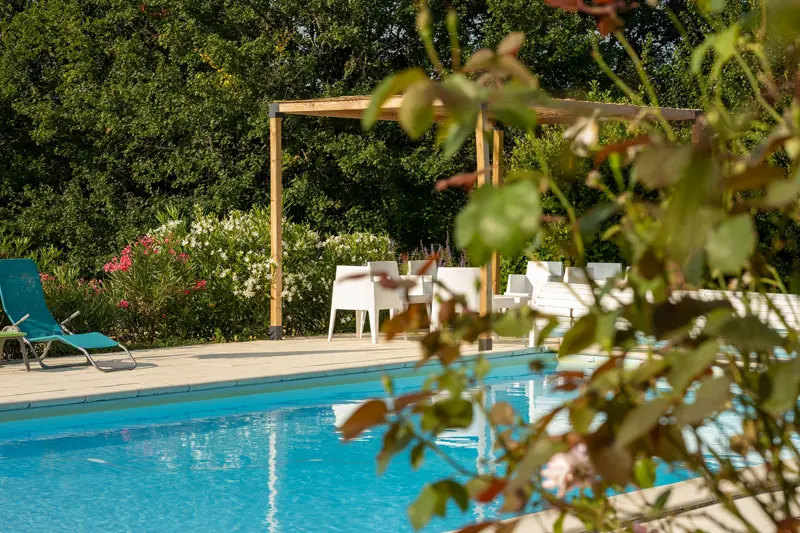 Uitrusten kan in het ruime en verwarmde zwembad (5,5 x12m) met prachtig zicht of in de tuin.