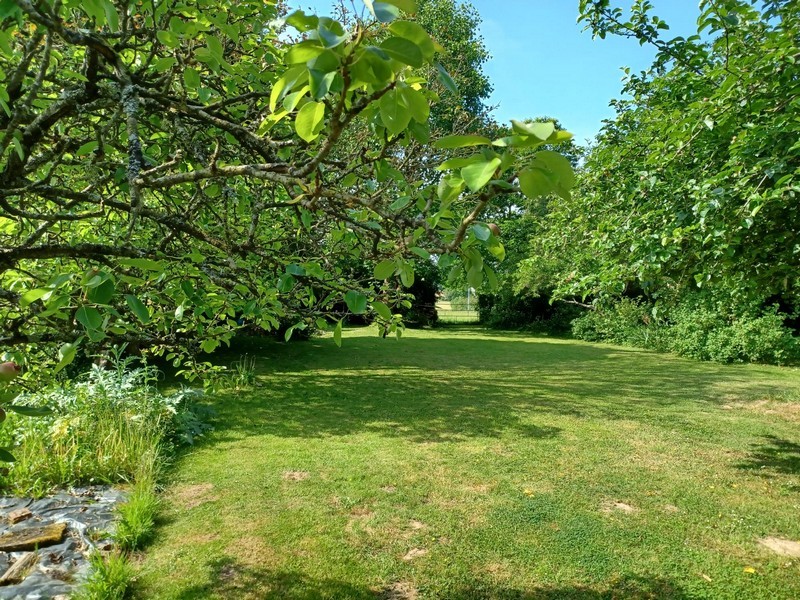 - uitzicht op de grote tuin met vele fruitbomen