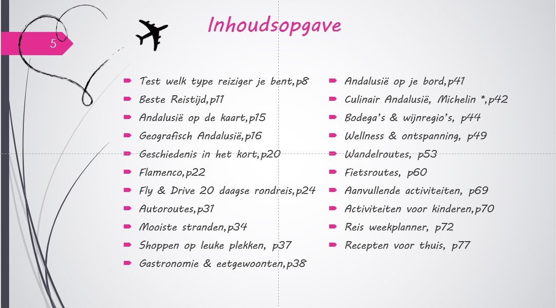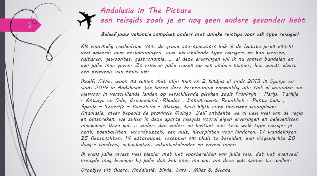 De digitale gids is anders dan de klassieke reisgidsen. Zo staat er een test in om te zien welk type reiziger je bent. Je berekent ook de beste reistijd naar Andalusië, kunt wegdromen over een uitgewerkte 20-daagste rondreis, je ontdekt 14 autoroutes, 25 fietsroutes en 17 wandelingen, maar daarnaast vind je in de gids ook nog een woordpuzzel, een online quiz, recepten om thuis te maken, kleurplaten voor kinderen, een vakantieplanner, een check-list voor bagage en reiskoffer, etc. Om de unieke reistips van Silvie niet te vergeten...