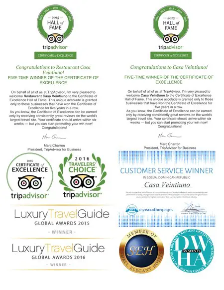 Ruim 10 jaar later is Casa Veintiuno een referentie geworden en zijn Saskia en Marc uitgegroeid tot rasechte Belgische ambassadeurs in het buitenlands toerisme. Gasten uit alle hoeken van de wereld willen in de B&B verblijven. De lijst met awards oogt intussen indrukwekkend. Er zijn er dan ook té veel om allemaal op te sommen. Eerst en vooral heeft Casa Veintiuno op die 10 jaar tijd reeds 2 ‘Hall of Fames’ awards ontvangen van Tripadvisor. Deze award krijg je slechts als je 5 opeenvolgende jaren het ‘Certificate of Excellence’ hebt gekregen. Casa Veintiuno is tevens het enige Small Hotel in heel de Dominicaanse Republiek dat in de Tripadvisor ‘Top 25 of Small Carribean Hotels’ staat – en nog wel op nummer 4. Verder is Casa Veintiuno door Luxury Tavel Guide reeds tweemaal uitgeroepen als beste small luxury hotel van de Dominicaanse Republiek. Maar ook in de Dominicaanse Republiek zélf is de erkenning groot, getuige de ‘Caribbean Gold Coast Award’. Enkele maanden geleden werd ook de keuken van Casa Veintiuno de hemel ingeprezen door Plus Magazine. Véél andere awards staan hier nog niet eens vermeld. De ‘Bij Landgenoten Achievement Award’ komt dus helemaal niet uit de lucht gevallen.