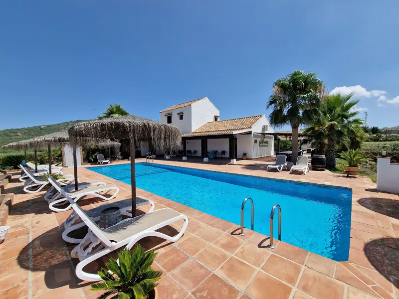 Onze hacienda heeft een ruim zwembad met ligbedden en parasols en biedt een prachtig uitzicht over de olijfgaarden en bergen.