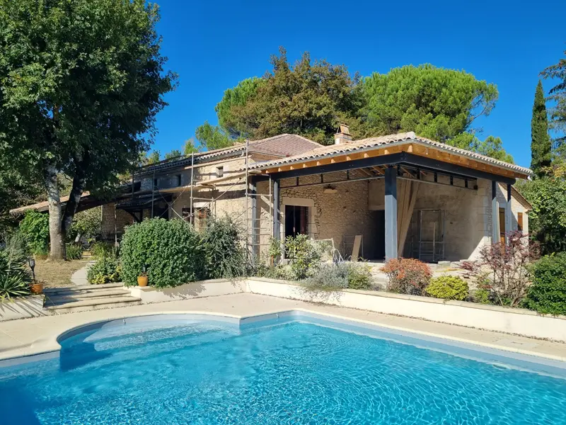 In 2023 werd een prachtig poolhouse gebouwd met een grote loungehoek, ideaal om samen te aperitieven en voor lange gezellige avonden samen.