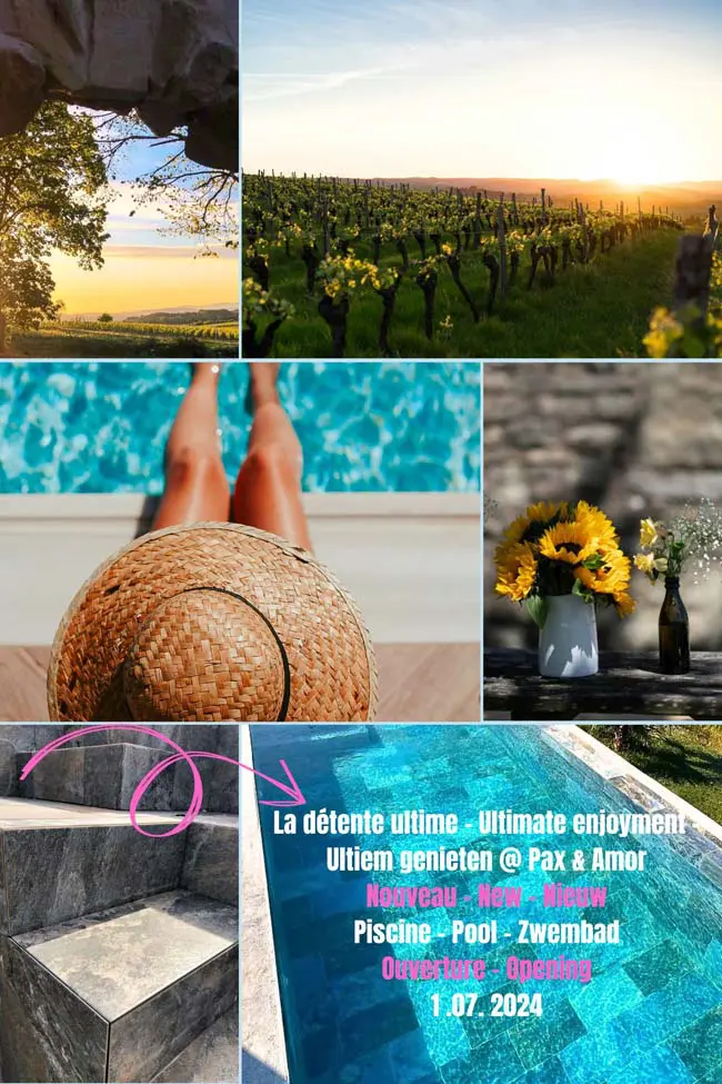 OPENING: 1 JULI 2024. Prachtig zwembad van 5 bij 11 meter, uitgerust met een waterval. Na je zwempartij, laat je verleiden door een wijnproeverij of een culinaire lekkernij aan de tafel van Jakob en Eefje. Buitengewone gerechten, met liefde bereid en met nadruk op lokale biologische producten en uit eigen tuin.