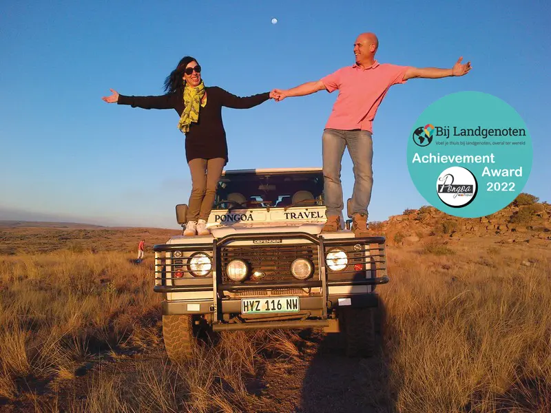 We zijn er bijzonder trots op de ‘Bij Landgenoten Achievement Award’ dit jaar te kunnen uitreiken aan Ronny Van den Hoeck & Yolande Commissaris van Pongoa Travel. Met deze award zetten we landgenoten in de kijker die hun toeristische droom niet alleen waarmaakten maar ook tot een hoger niveau wisten te tillen. Als touroperator organiseert Pongoa Travel begeleide dagtochten, excursies en safari’s in Zuid-Afrika en de directe buurlanden, met name Botswana, Lesotho, Mozambique, Namibië, Swaziland en Zimbabwe. Bovendien baten Ronny & Yolande de B&B Ponciana Superior Guesthouse uit in de regio Hartbeespoortdam.