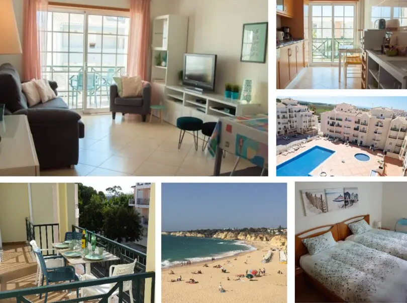 Modern en volledig opgefrist appartement in complex Solario da Praia, met 2 slaapkamers, badkamer met toilet + apart toilet (met lavabo warm en koud water), volledig ingerichte keuken met vaatwasser en wasmachine, zonnig terras (ochtend tot avond), gemeenschappelijk zwembad en staanplaats in ondergrondse garages.