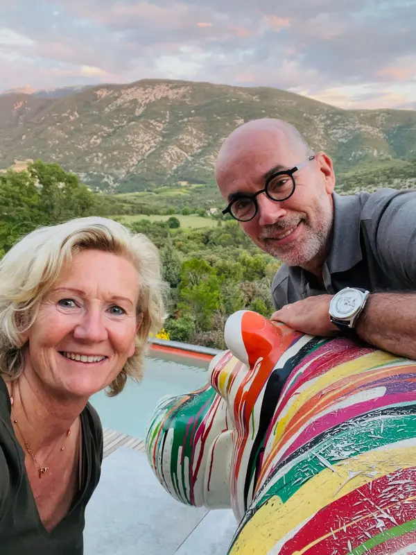 Eigenaren Marie-Pascale en Erwin, een reis-reportage-fotografe en een consultant uit Waregem, houden van reizen, sport en kunst. Niet te verwonderen dus dat ze instant verliefd werden op dit uniek huis dat gebouwd werd door een Italiaan met heel veel smaak voor design.