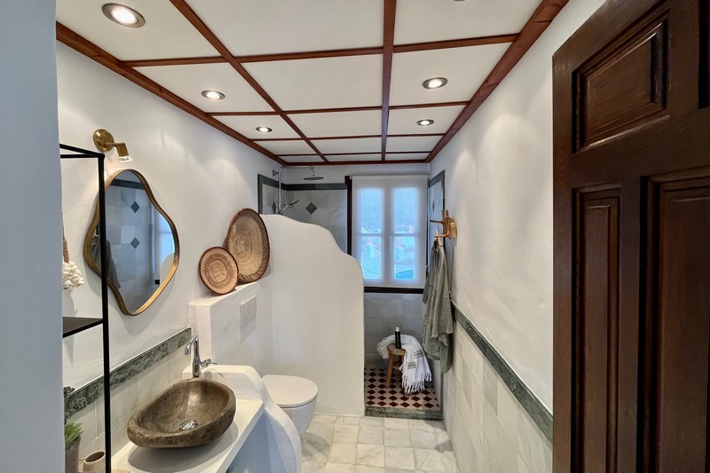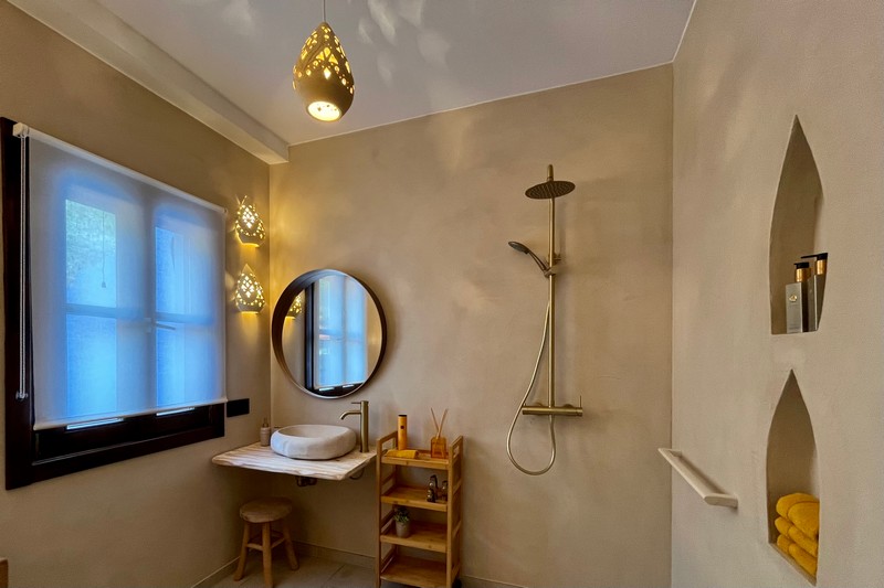 - Een tweede badkamer met regendouche, inbouwtoilet en een wastafel gemaakt van natuursteen.